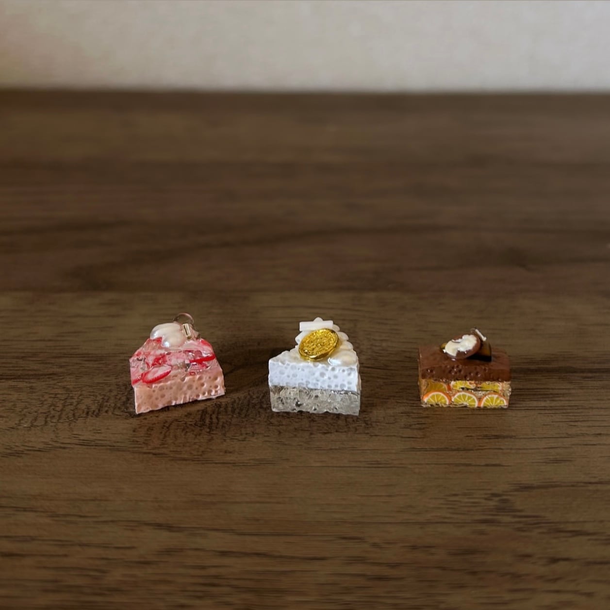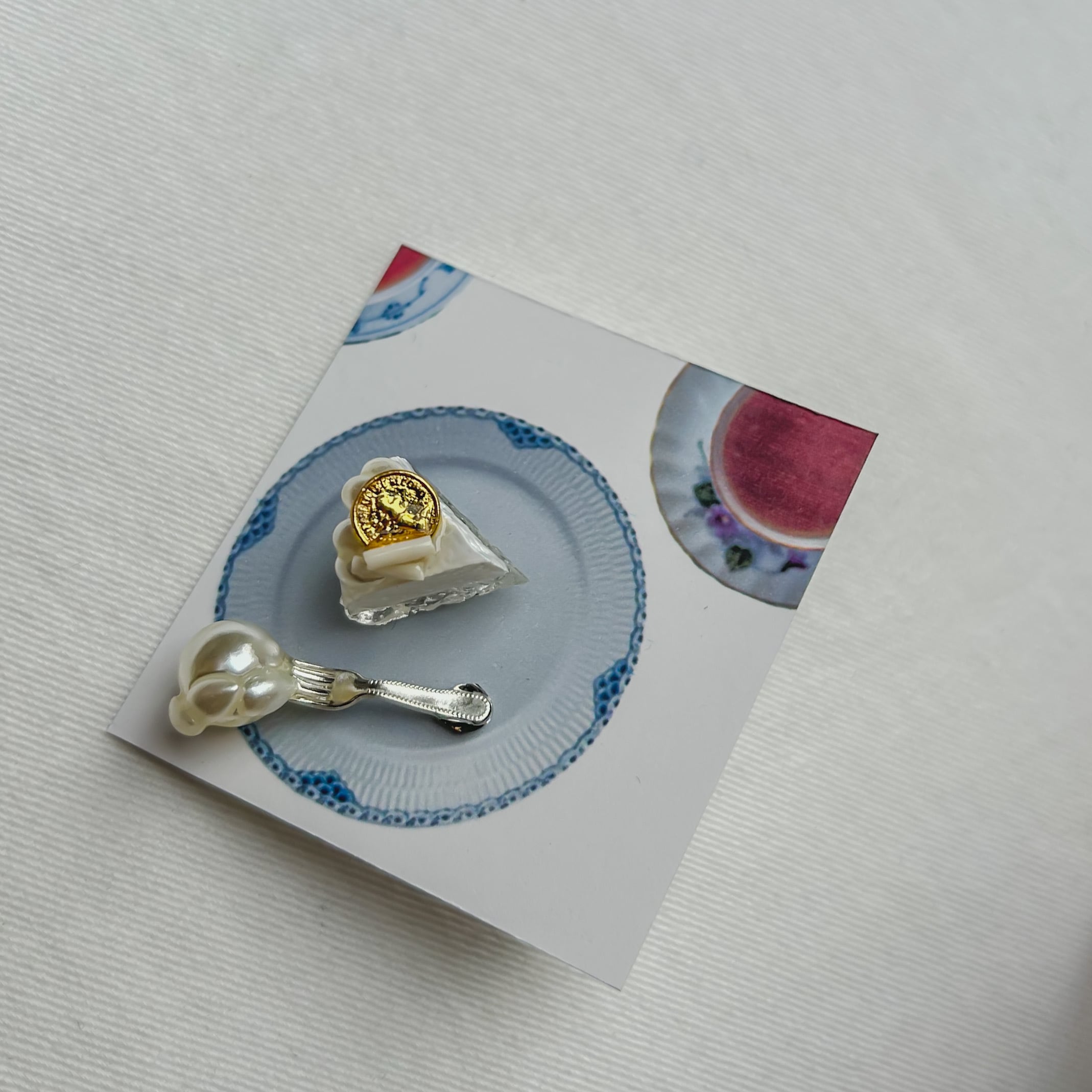 片耳はケーキ、もう片耳はフォークのアシンメトリーでお届け致します。